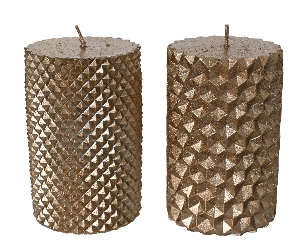 Bronz metálfényű tömbgyertya dombornyomott geometrikus mintás