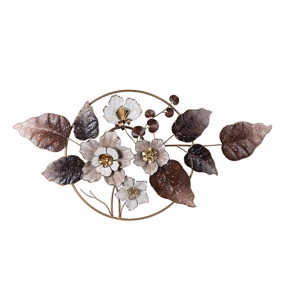 Fém virágos falikép, térbeli, 3D virágos fali dísz, barna-fehér-arany, 115x58 cm