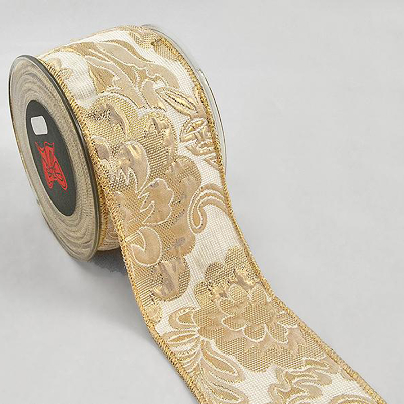 Karácsonyi szalag, masni, szalagtekercs díszcsomagoláshoz, (6,7x450 cm), barokk stílusú virágok, arany