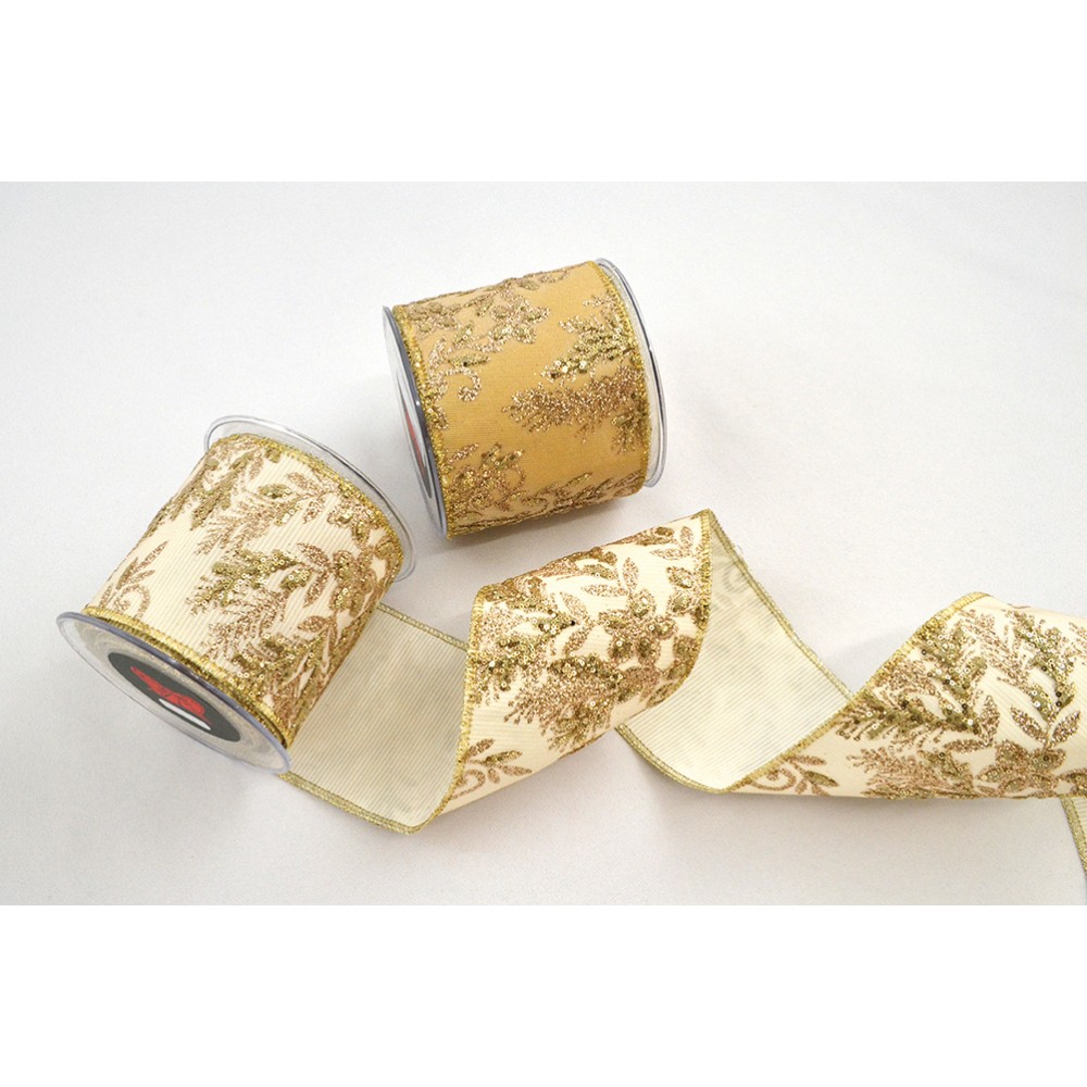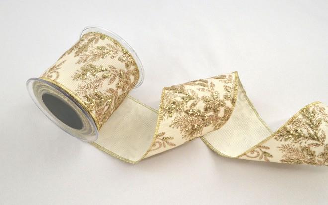 Karácsonyi szalag, masni, szalagtekercs díszcsomagoláshoz, (10x450 cm), barokk stílusú glitteres virágok, bézs/arany, fehér/arany