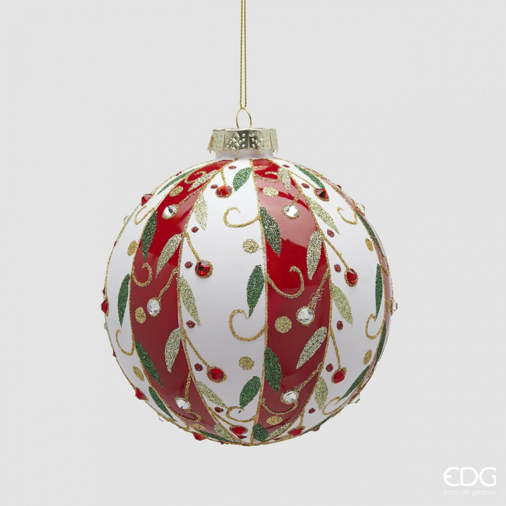 Piros-fehér csíkos üveggömb, fagyöngy mintás, 12 cm