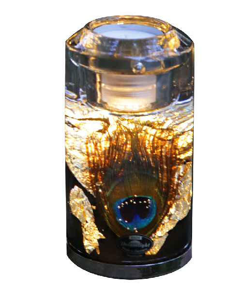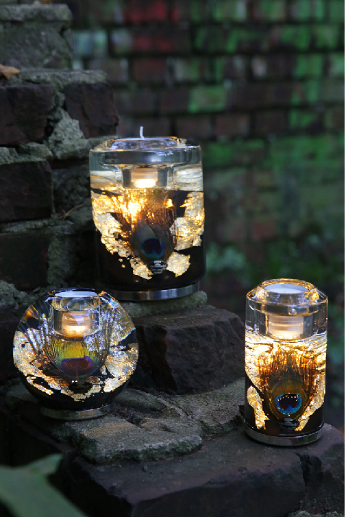 Zselés mécsestartó, üveg mécsestartó, LED-es mécsestartó, pávás dísz, pávatollas dísz